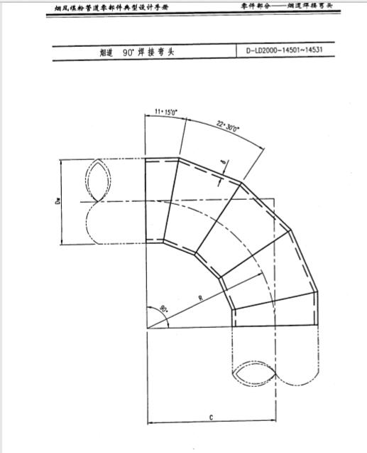 這樣的一個拼接過程里邊,它是由以下的這幾個角度來拼成的,咱說的是90度的,首先它的兩端是11.5度,這樣的一個度數的部位。中間三個環節都是22.5度。等于是22.5度×3。得出來的是67.5度。兩端的兩個11.25度×2。是22.5度。67.5度加22.5度。正好一個直角90度的一個拼接彎頭產品就出現了。在這樣的一個規范里邊,是有一個斷節下料樣板展開圖,還有管子下料圖。包括焊縫的尺寸。也都是有著相應的規定。
